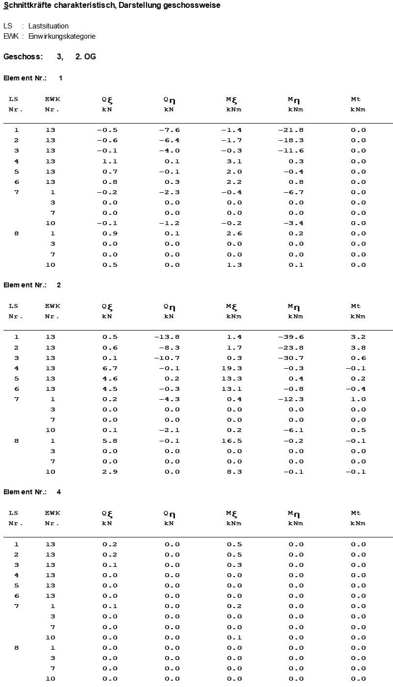Der folgende Ausschnitt zeigt einen Ausdruck der Ergebnisse mit der Layoutvariante Kennziffer "2", wobei die Gliederung der Abschnitte auf erster Ebene nach Geschossen und auf zweiter Ebene nach Aussteifungselementen erfolgt. Die Ergebnistabelle ist in Spalte 1 nach Lastsituationen und in Spalte 2 nach Einwirkungskategorien sortiert.