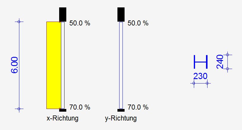 der obere Abschnitt ist immer auskragend, wahlweise elastische Einspannungen an den Enden des unteren Abschnitts, die über die Geometrie der angrenzenden Bauteile (Balken, Stützen, Fundamente) automatisch ermittelt werden, unterschiedliche Systeme in x- und y-Richtung möglich