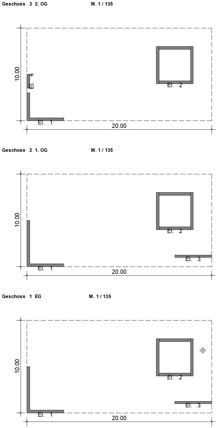 Dazu wird ein fiktives 3-geschossiges Gebäude mit vier Austeifungselementen betrachtet. Von oben nach unten gesehen, geht das Element Nr. 4 beim Wechsel vom 2. ins 1. OG in Element Nr. 1 über. Das Element Nr. 3 ist im 2. OG nicht vorhanden und beginnt erst im 1.OG. Einen Überlick der gesamten Elementanordnung geben die folgenden Skizzen der einzelnen Geschosse.