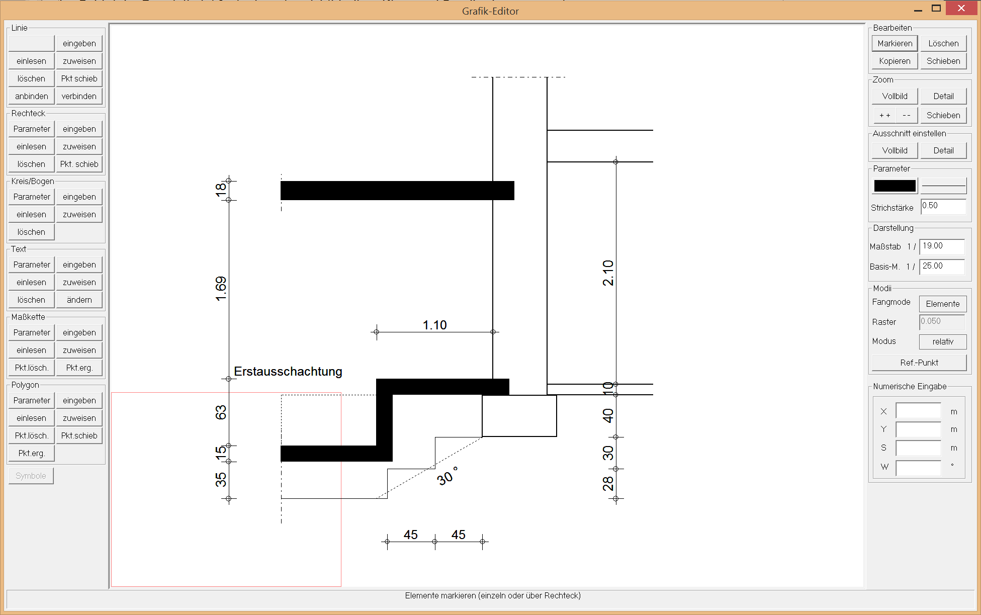 Über Elementparameter kann jedes Element individuell gestaltet werden. Zur Konstruktion steht die gesamte Zeichenfläche zur Verfügung. Strichstärke und Schriftgröße können unabhängig vom Zeichenmaßstab über einen Basismaßstab eingestellt bzw. angepasst werden.